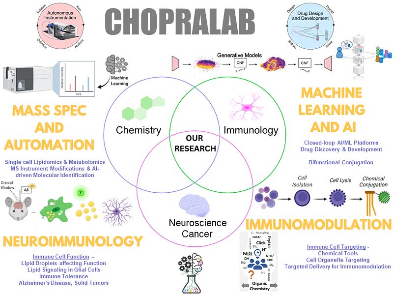 Our group's vision is to establish a Center for Chemical and Cellular Immunology with both basic science and translational focus to affect human health in Cancer, Neuroimmunology, and beyond, eventually affecting all areas of Medicine. Such a Center does not exist in the United States, and we would like to develop this world-class program as the next frontier in Medicine by bringing together ideas and expertise from Immunology, Cancer Biology, Neuroscience, Chemistry, Artificial Intelligence/Machine Learning, Engineering and Medicine. The initial focus of our group have been to translate novel immunological therapies for cancer and neurodegeneration by developing tools and targeted therapeutics. Neuroimmunology is where cancer immunology was ~15 years ago and this is a huge untapped opportunity for the future of medicine. The basic science in chemistry, immunology and engineering in partnership with disease experts and clinical scientists will be essential to translate these discoveries to new medical frontiers beyond small molecules, biologics and targeted cell therapy.